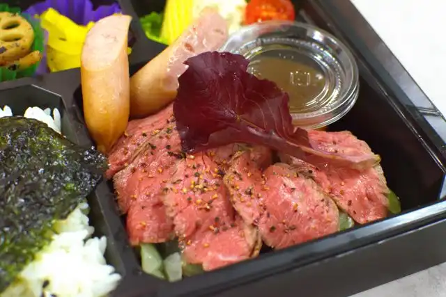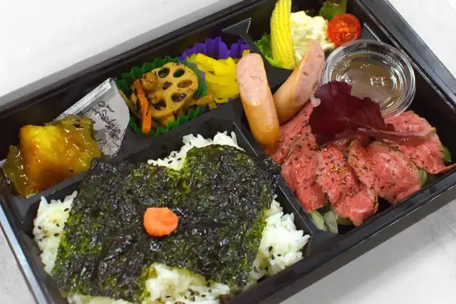 白ご飯200g/韓国のり/牛ステーキ/和風おろしソース100%ポークウインナー/柚子蜜芋/蓮根と根菜の特製ひじき煮/北海道産ブランド芋「キタアカリ」使用の特製ポテトサラダ/刻みたくあん/
