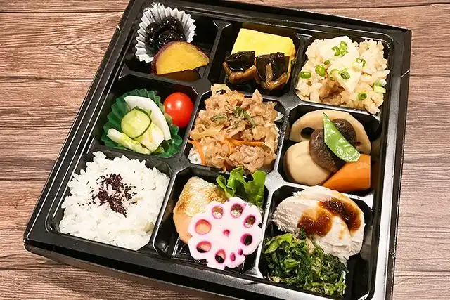 筍ご飯60g / 牛すき煮飯60g / ゆかり飯60g /国産鮭の塩焼き / 蒸し鶏 / ほうれん草おかか和え / 季節の煮物(蓮根・里芋・人参・椎茸・絹さや) / にしんの昆布巻き / 卵焼き / 黒豆 / さつま金時 / 漬物 / ミニトマト