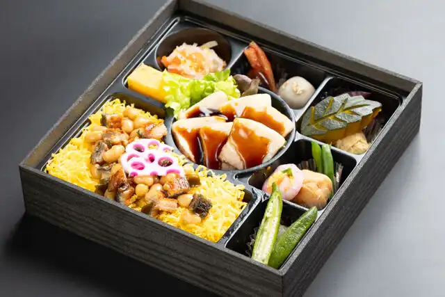 うなぎちらし(ごはん160g/錦糸玉子/五目大豆/うなぎ/花チラシれんこん)/豚の角煮/ゆずなます/梅ごぼう/黒花豆/さといも/かぼちゃ/湯葉/ごぼう八幡巻/煮物(いんげん/がんも)/海老絹田まき/おくら