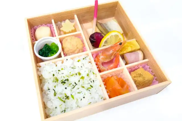 菜飯ご飯100g / 鱈の幽庵焼き / 厚焼き玉子 / 合鴨ロース / しゅうまい / 人参煮 / 里芋含め煮 / 麩 / 冬瓜煮 / 青菜お浸し / 海老生姜煮 / 甘味 / 柴漬け