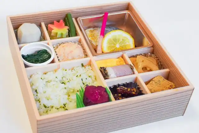 菜飯ご飯130g / 鰆の幽庵焼き / 厚焼き玉子 / 合鴨ロース / しゅうまい / 蓮根金平 / 里芋含め煮 / 麩 / 冬瓜煮 / 青菜お浸し / 鮪と昆布の佃煮 / 甘味 / 柴漬け