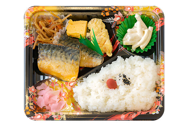 ご飯(200g)・さばの味噌煮・玉子焼き・揚げ物・マカロニサラダ・きんぴらごぼう・漬物