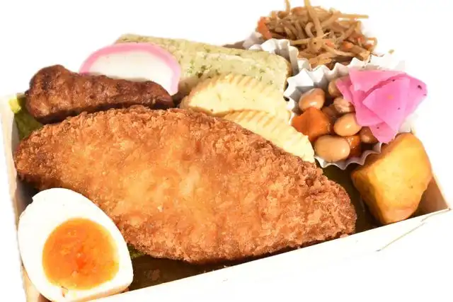 ご飯200g/白身魚フライ/玉子焼き/磯辺揚げ/つくね/かまぼこ/大学芋/季節の副菜/きんぴらごぼう/半熟卵風/漬物/海苔