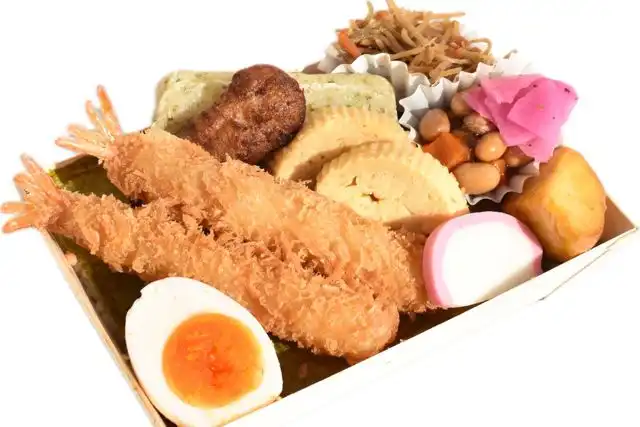 ご飯200g/エビフライ/玉子焼き/磯辺揚げ/つくね/かまぼこ/大学芋/季節の副菜/きんぴらごぼう/半熟卵風/漬物/海苔
