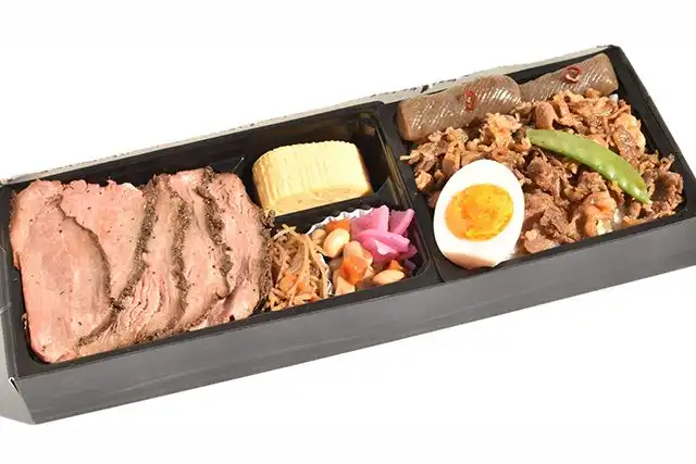 ローストビーフと牛すき焼きを主菜とした、商談・ご接待向けの高級御膳です。牛すき焼きには、厳選した牛バラ肉を使用し、余分な脂を丁寧に抜いた後、創業以来受け継ぐ秘伝の割り下でじっくりと味付け。コクがありながらも後味の良い、上品な味わいに仕上げております。ローストビーフ重には、赤身の旨みとやわらかさが特長のトップサイド(内もも)を使用し、黒米・黒ゴマ・黒コショウで味付け。真空調理にて丁寧に火入れすることで、肉のうまみを閉じ込めた、しっとりとした味わいをお楽しみいただけます。副菜には大豆の旨煮、きんぴらごぼう、紅白生姜、漬物を添え、半熟卵風を組み合わせることで味の広がりと満足感を演出。白飯との相性にも配慮した、川越らしい落ち着きと確かな品質を感じていただける御膳です。「印象に残る一食」をお求めの場面に、ぜひご利用ください。