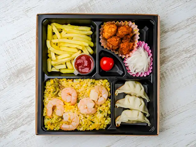 白米(200g)、海老、玉子、ネギ、季節の野菜、季節の中華惣菜、フライドポテト、揚げ物