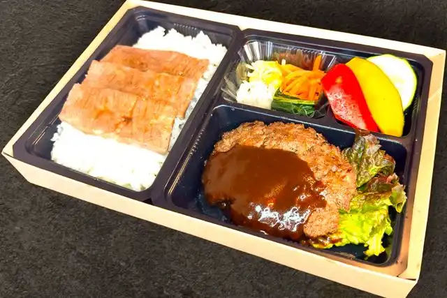 九州産A5ランクのブランド黒毛和牛を100%使用した、まるでステーキを食べているかのような肉肉しい手ごねハンバーグと自慢の焼肉がセットになったボリュームたっぷりのお弁当。ソースはデミグラスソースです。