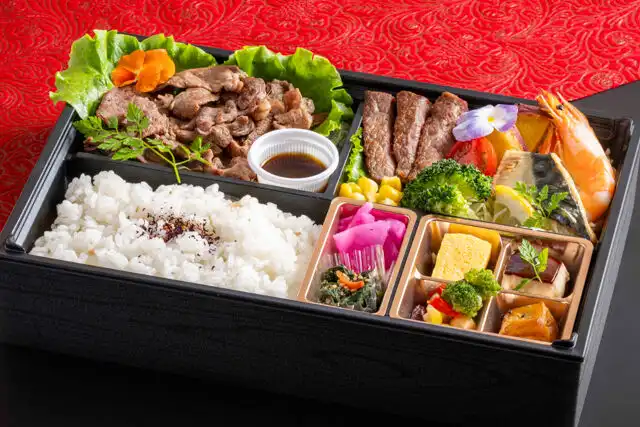 ご飯(200g)/玉子焼き/季節の副菜2種/プチケーキ/漬物/お浸し/氷見牛焼肉/リーフ/ソース/ステーキ/焼き魚/海老/季節の野菜