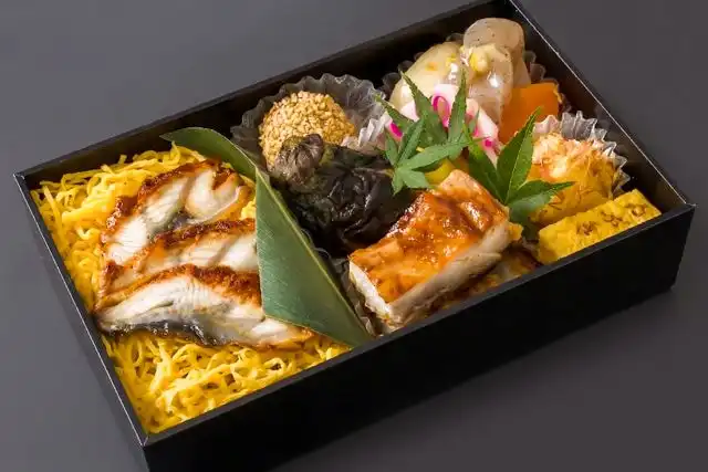 うなぎご飯(190g)、鶏曽於麹焼き、煮物、特製ポテトサラダ、厚焼き玉子、なすび、さつまいも甘露煮、ごま団子