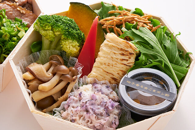 【おかず】ハラミ焼肉、黒七味風味のネギダレ、柴漬け、ゆかりポテトサラダ、きのこの和風マリネ、湯葉、温野菜サラダ、柚子薫る金胡麻ポン酢