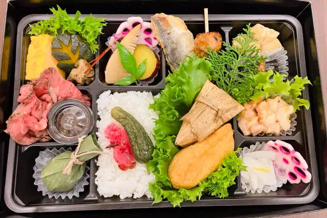 白飯(2種飾り)110g/鶏ちまき/お稲荷さん/特製ローストビーフ(和風ソース)/厚焼き玉子/かぼちゃの煮つけ/あかにし貝のスモーク串/焼きタケノコ/さつま芋の甘露煮/さば塩焼き/七味つくね串/五目巾着煮/昆布巻き/和風チキンサラダ/お漬物/花れんこん/添え野菜/笹だんご