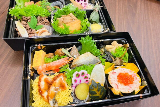 1段目:特製うなぎご飯110g/蟹とイクラのご飯110g/厚焼き玉子/七味つくね串/有頭海老/さば塩焼き/バイ貝/なすの海老詰め/あかにし貝のスモーク串/五目巾着煮/笹かま/かぼちゃの煮つけ/さつま芋の甘露煮/花れんこん/添え野菜