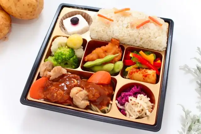 デミグラス煮込み鶏の唐揚げ/スパイスハッシュドポテト/3種のパプリカサラダ/南蛮唐揚げ/枝豆/うずらのピクルス/ブロッコリーとカリフラワーのジェノベーゼ/大根マヨネーズ/柴漬け/デザート/しその炊き込みごはん[約170g]