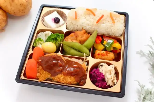 デミグラス煮込みメンチカツ/スパイスハッシュドポテト/3種のパプリカサラダ/南蛮唐揚げ/枝豆/うずらのピクルス/ブロッコリーとカリフラワーのジェノベーゼ/大根マヨネーズ/柴漬け/デザート/しその炊き込みごはん[約170g]