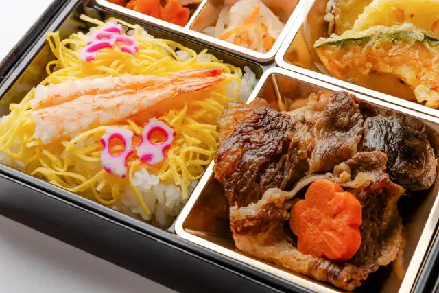 /海老ちらしと最高級A5ランク黒毛和牛すき焼きと天ぷらと出汁の幕の内御膳