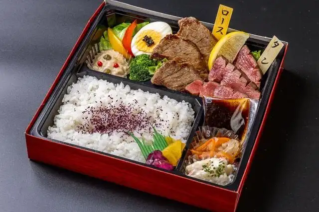 白米(220g)、漬物、牛タン、牛ロース、カルパッチョサラダ、マカロニサラダ、ゆで卵、キャベツ、ブロッコリー、パプリカ、トンナートソース
