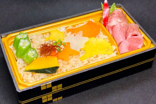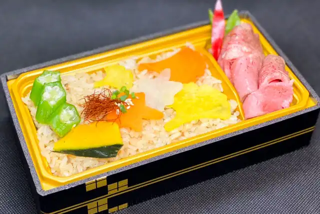 食欲をそそる香り高い松茸ご飯に、低温調理でしっとり柔らかく仕上げた厳選牛リブロース焼肉がベストマッチなお弁当。