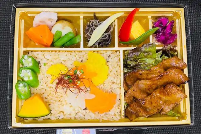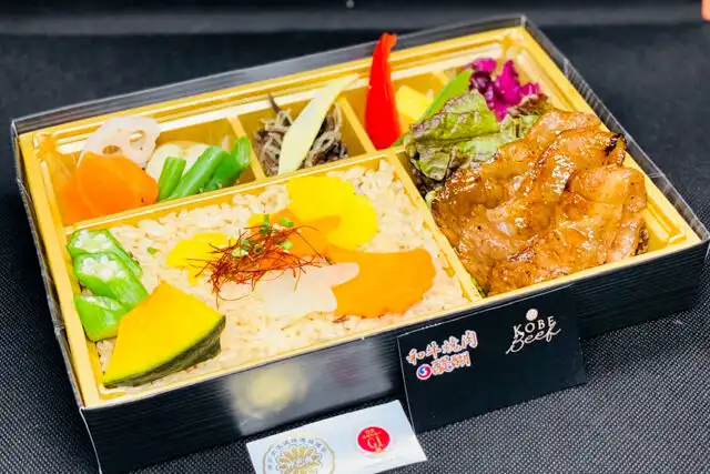 香り高い松茸ご飯と、黒毛和牛のチャンピオン、神戸ビーフのやわらかカルビ焼肉と、手間暇かけて仕込んだ副菜が楽しい贅沢お弁当。