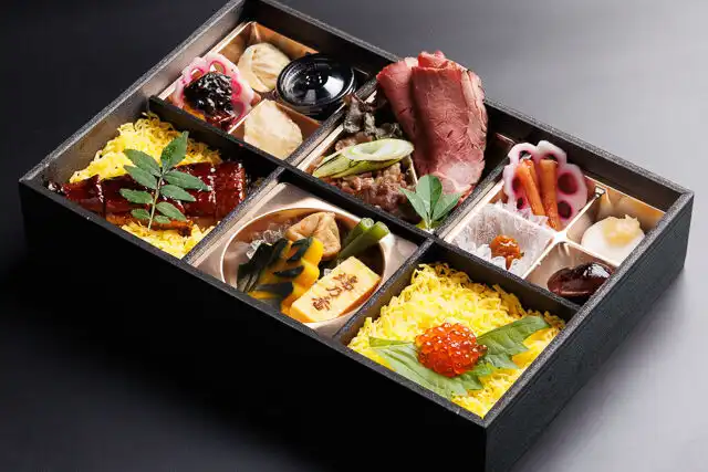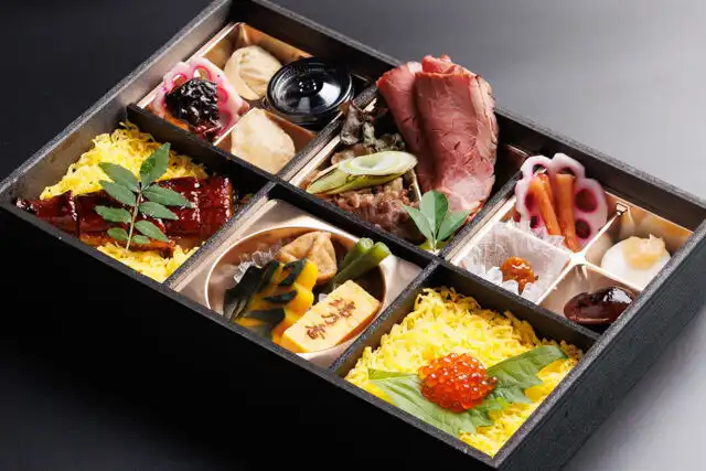 瑞乃香のおもてなしの心を詰めた贅沢な懐石弁当です。すき焼きとローストビーフをメインに、ご飯はうなぎちらしといくらちらしで華やかに。海の幸・山の幸を彩りよく配した御菜の数々を詰め合わせ、目でも舌でもお愉しみいただける、大切な場を彩るにふさわしいお弁当です。