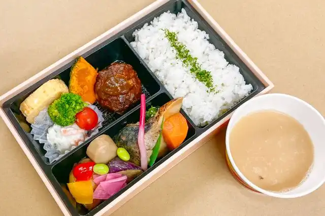 ご飯(210g)、ハンバーグ、若鶏ゆず風味、サラダ、西京焼き、野菜の煮物、特製だし巻き、特製とろろ