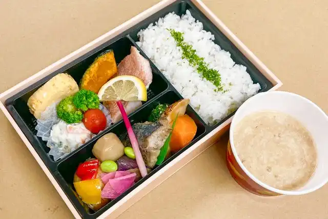 ご飯(210g)、赤魚岩塩焼き、若鶏ゆず風味サラダ、鯵西京焼き、野菜の煮物、特製だし巻き、特製とろろ