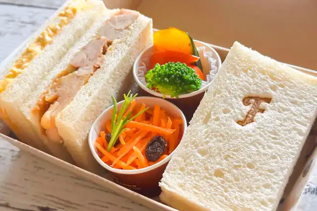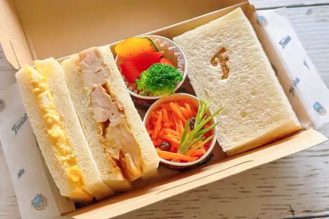 試合で消耗したエネルギーを素早く回復するため、ボリューミーなチキンと、定番たまご、ハムチーズをサンドしました。パンには、勝利への願いを込めたフロンターレのクラブロゴ「F」の焼き印を施しています。