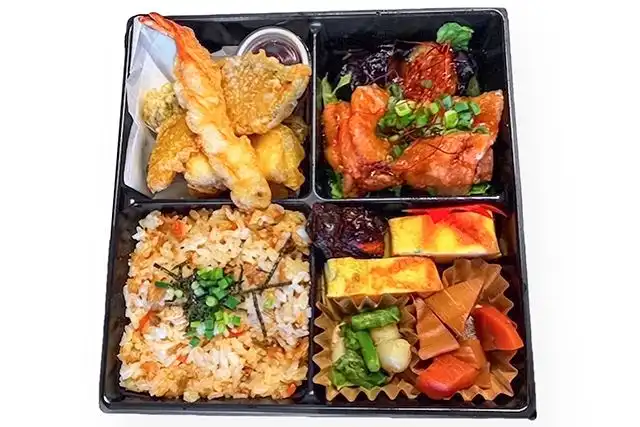 サクッとあげた天ぷらと特製の鶏とナスのみぞれ煮の和食弁当。幅広い世代に対応できるお弁当です。