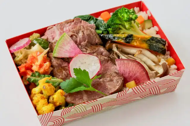 季節のピラフ200g、ビーフステーキ、季節の野菜を使用したマリネ、サラダ各種