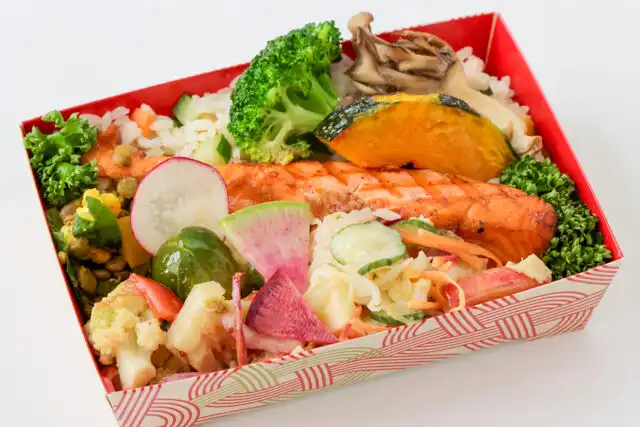 季節のピラフ200g、サーモンテーキ、季節の野菜を使用したマリネ、サラダ各種