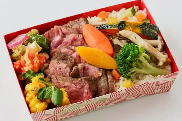 季節のピラフ200g、ビーフステーキ、季節の野菜を使用したマリネ、サラダ各種