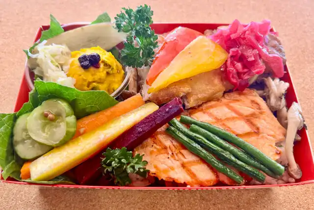 季節のピラフ200g、サーモングリル、チキンステーキ、季節の野菜を使用したマリネ、サラダ各種