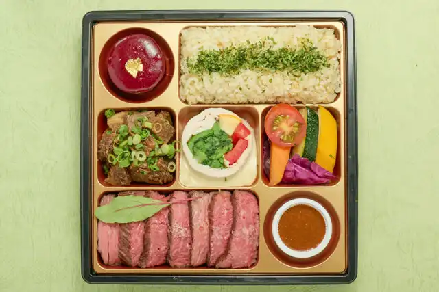プリュシュモンド特製のお肉料理が堪能できる一品。自社農園を持ち新鮮な季節野菜を使い、彩りも鮮やかに。厳選して仕入れた上質な赤身ステーキを贅沢に盛り付けました。一つのお弁当で様々な楽しみを得られる満足感の高い一品をどうぞ。