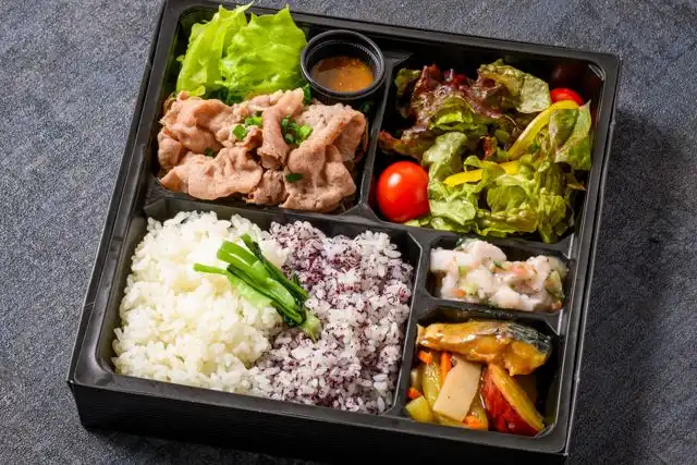 白米100g/ゆかりご飯100g/しゃぶしゃぶ黒毛和牛バラ50g/しゃぶしゃぶ国産牛ロース50g/フキと蓮根の塩きんぴら/さつまいものレモン煮/長芋ときゅうりの梅肉和え/サラダ/さばの味噌煮
