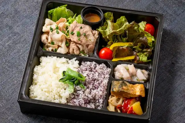 一晩じっくり漬け込み柔らかく茹でた道産もち豚バラと道産もち豚肩ロースの合盛りしゃぶしゃぶに金胡麻ポン酢を添えて主菜に。副菜の細部までこだわり抜いた和の御膳弁当です。