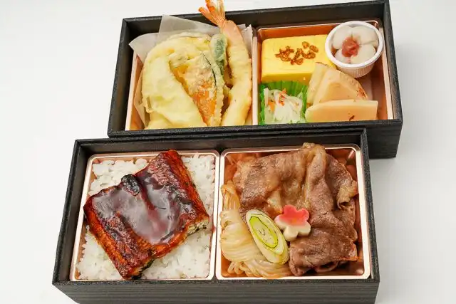 【ごはん】うな重(ご飯160g)【おかず】<主菜>黒毛和牛すき焼き<副菜>天ぷら・だし巻き玉子・小貝柱・なます等
