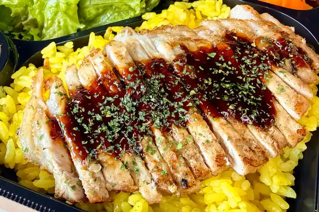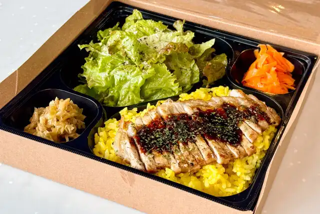 ライス180g、ポークステーキ、ソース、季節の副菜2種、サラダ