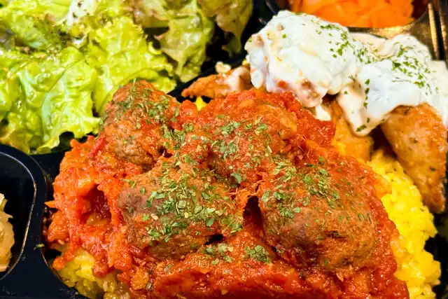 ライス180g、チキンクリスピー、ソース、トマトミートボール、季節の副菜2種、サラダ