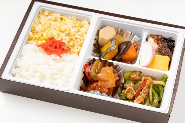 ご飯によく合う青椒肉絲と肉団子をメインに、白飯とチャーハンの両方をお召し上がり頂けるお弁当です。詰め合わせた副菜とともにお楽しみください。