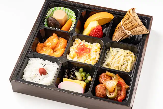 特製甘酢ソースの肉団子をメインに、和食の要素と中華の要素を織り交ぜた、味も見た目も楽しい9マス弁当です。ロケや会議などで幅広くご活用ください。