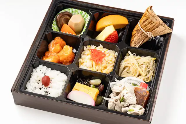 甘辛ソースで仕上げた中華風の豚しゃぶ(雲白肉ウンパイロウ)をメインにした、見た目にも楽しい和中折衷のお弁当です。9マスに詰めた味わいをお楽しみください。