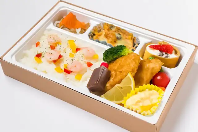 バターライス180g、パプリカ、エビ、水郷どり、ブロッコリー、トマト、レモン、玉ねぎ、ニンジン、副菜2種、クレープ(季節によってフルーツになります)