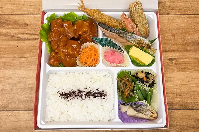 当店の人気NO.1の元祖仙台チリチキン(から揚げ)をメインに天ぷら盛り合わせ・焼鮭と、色とりどりの副菜を盛り込んだ幕の内弁当。