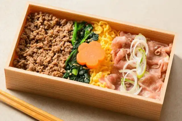 一つのお弁当箱におかずとご飯を詰め込みました。お手軽にお召し上がりいただけます。