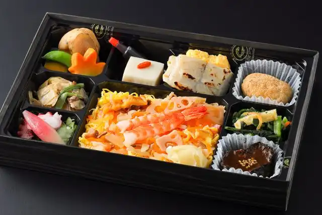 焼魚、小松菜油炒めなど彩り豊かな食材を盛り込んだお弁当です。ちらし寿司とともにお楽しみください。