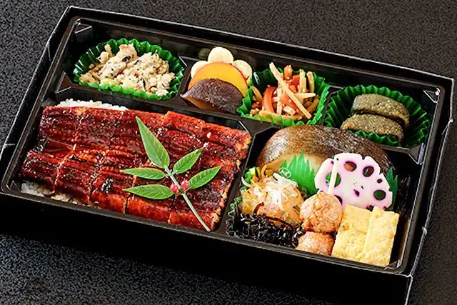 ご飯250g/鰻/銀鱈照り焼き/豆腐含煮/さつまいもレモン煮/しいたけ旨煮/きんぴらごぼう/おから煮/玉子焼き/とりつみれ/しそ昆布/なます/漬物/花蓮根/生麩