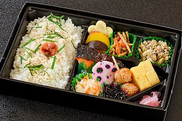 ご飯250g/鯛田麩/鮭の幽庵焼き/梅干し/大葉/豆腐含煮/さつまいもレモン煮/しいたけ旨煮/きんぴらごぼう/おから煮/玉子焼き/とりつみれ/しそ昆布/なます/漬物/花蓮根