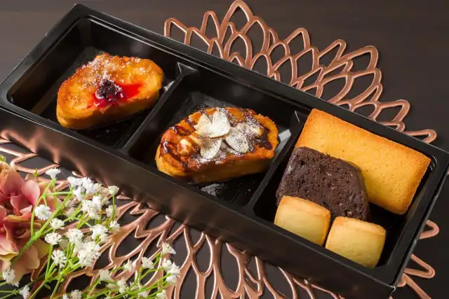 当店名物の30時間じっくり漬け込んだ極上のフレンチトーストに焼き菓子を盛り合わせました。