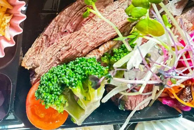 彩り豊かで贅沢感あふれる「ローストビーフ弁当」です。しっとりとやわらかく仕上げたローストビーフが主役。肉の旨みを閉じ込めたスライスが美しく並び、ひと口頬ばると、ジューシーで深みのある味わいが口いっぱいに広がります。上にはブロッコリーやにんじん、ミニトマト、カイワレなど、彩り豊かな野菜をたっぷり添えてヘルシーに。肉のコクと野菜のフレッシュさが絶妙に調和しています。ご飯はふっくらと炊き上げた白米に、香り高い梅干しを添えてさっぱりと。見た目にも美しく、栄養のバランスにも優れた一折。お肉の満足感と家庭的なぬくもりを両立した、心もお腹も満たされる贅沢なお弁当です。ランチタイムを特別なひとときに変える、上品でやさしい味わいをお楽しみください。