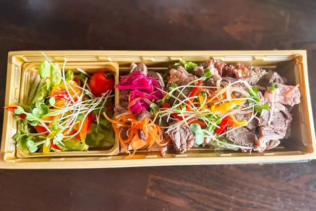 彩り豊かで贅沢感あふれる「ローストビーフ弁当」です。しっとりとやわらかく仕上げたローストビーフが主役。肉の旨みを閉じ込めたスライスが美しく並び、ひと口頬ばると、ジューシーで深みのある味わいが口いっぱいに広がります。上にはブロッコリーやにんじん、ミニトマト、カイワレなど、彩り豊かな野菜をたっぷり添えてヘルシーに。肉のコクと野菜のフレッシュさが絶妙に調和しています。ご飯はふっくらと炊き上げた白米に、香り高い梅干しを添えてさっぱりと。見た目にも美しく、栄養のバランスにも優れた一折。お肉の満足感と家庭的なぬくもりを両立した、心もお腹も満たされる贅沢なお弁当です。ランチタイムを特別なひとときに変える、上品でやさしい味わいをお楽しみください。