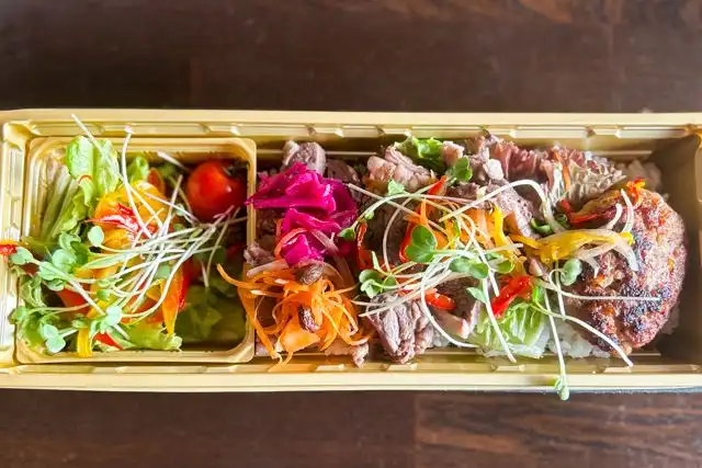 旨みたっぷりのリブアイと、ふっくらジューシーな牛肉ハンバーグを一度に堪能。特製ソースとご飯が絡み合い、ひと口ごとに異なる美味しさが押し寄せます。彩り豊かな野菜やマリネが添えられ、見た目も華やかで、最後までさっぱりと楽しめるバランス。しっかりスタミナをつけたい日にぴったりの、満足感抜群の贅沢なご褒美重です。